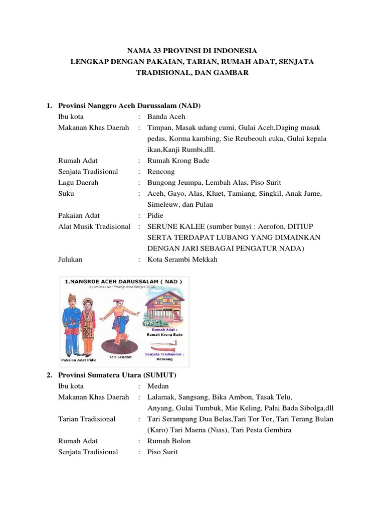 DOC) 34 provinsi di indonesia lengkap, rumah adat, pakaian adat, tari, senjata tradisional.docx | Teja Sukmana - Academia.edu