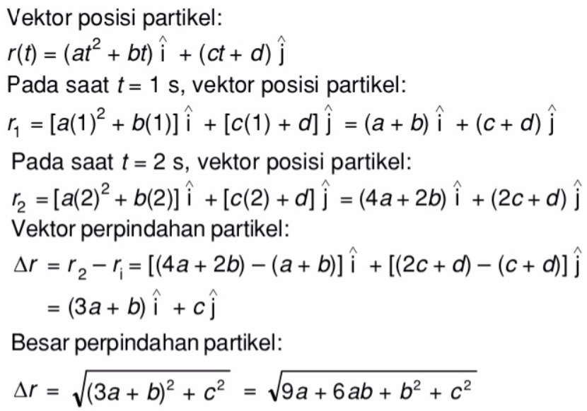 Posisi partikel sebagai fungsi waktu dinyatakan oleh persamaan vektor posisi r(t) = (a t2+ b t) i + (ct + d) j - Mas Dayat