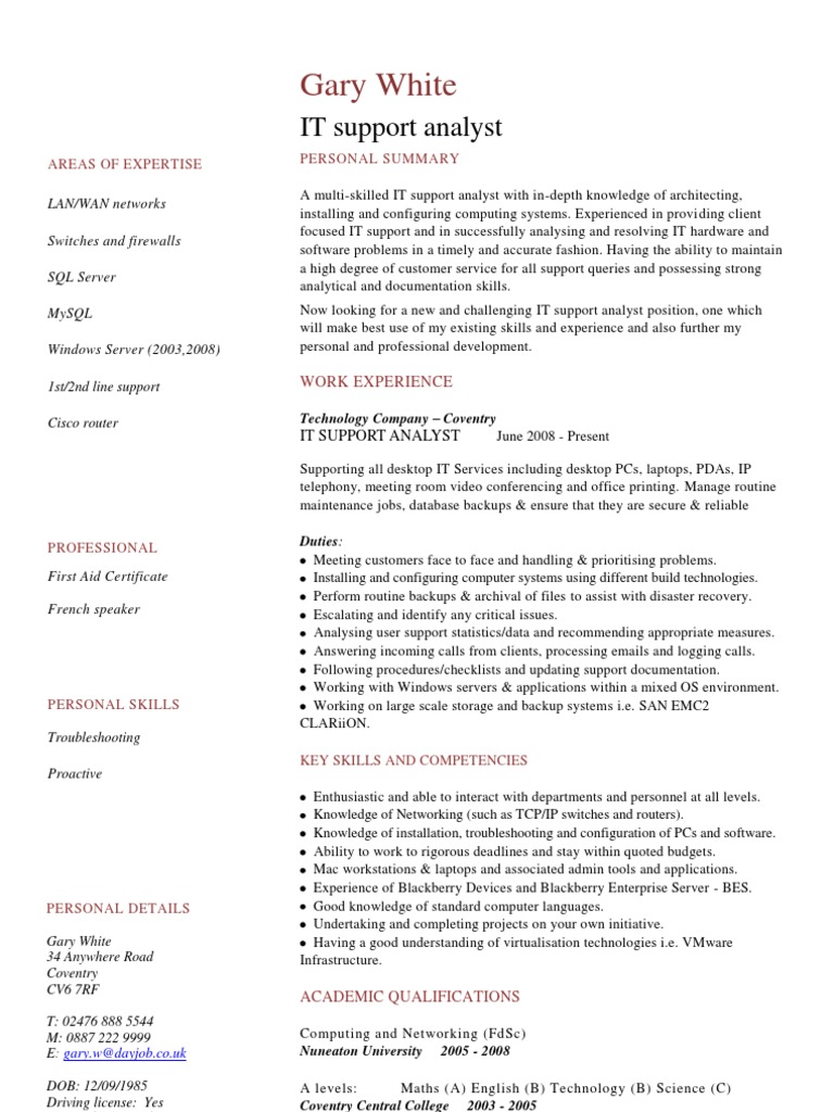 IT Support Analyst CV | Backup | Computer Network