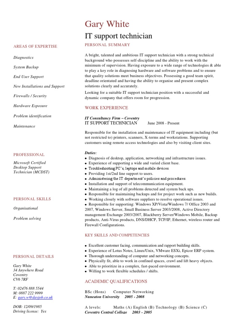 IT Desktop Support Technician CV Example - Learnist.org