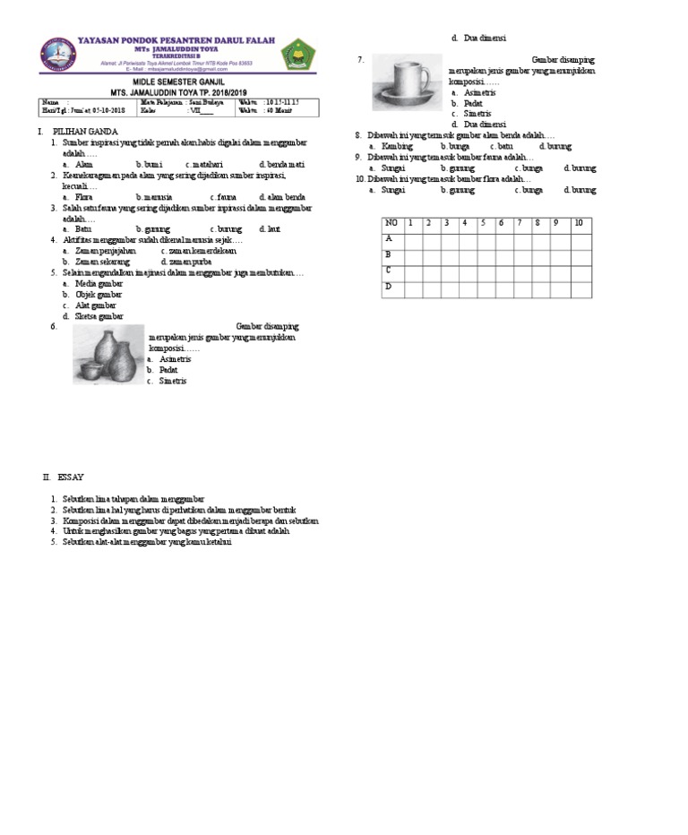 Nama: Hari/Tgl: Jum’at, 05-10-2018 Mata Pelajaran: Seni Budaya Kelas: Vii____ Waktu: 10.15-11.15 Waktu: 60 Menit