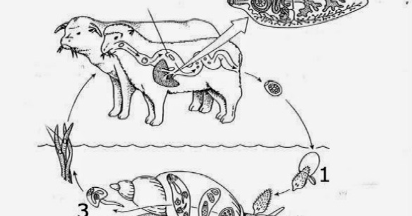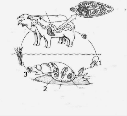 Tahap daur hidup Fasciola hepatica yang di tunjuk oleh 1, 2, dan 3 adalah - Mas Dayat