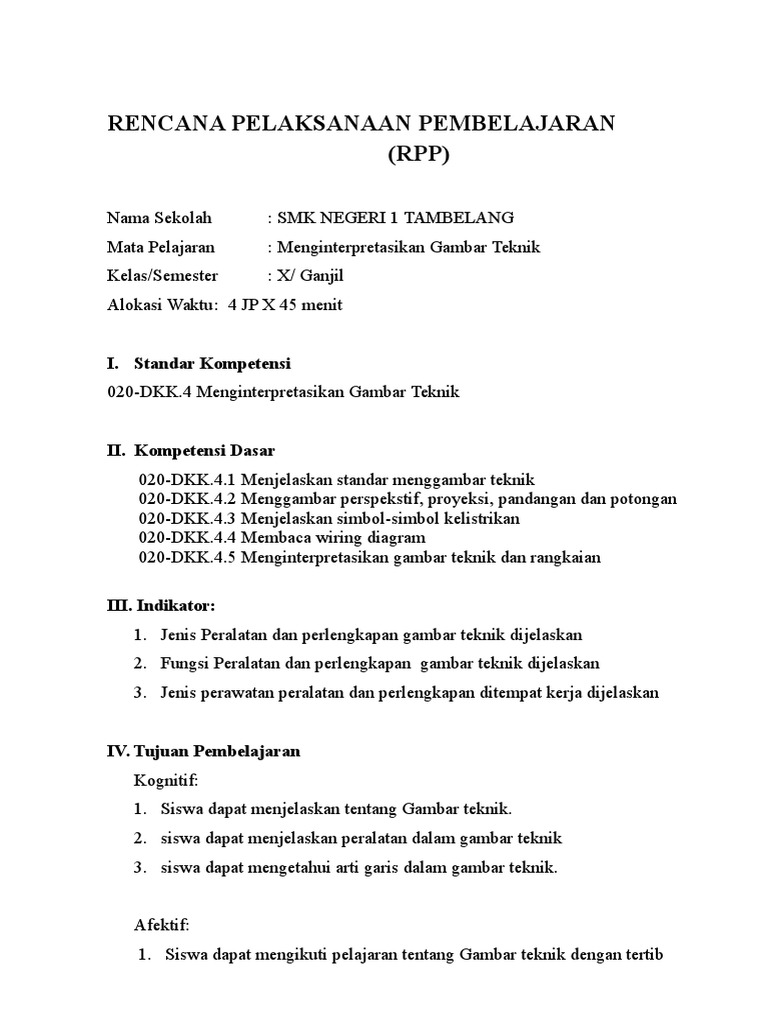 RPP Gambar Teknik Listrik kelas X Program keahlian Teknik Instalasi Tenaga Listrik ~ Blog edukasi