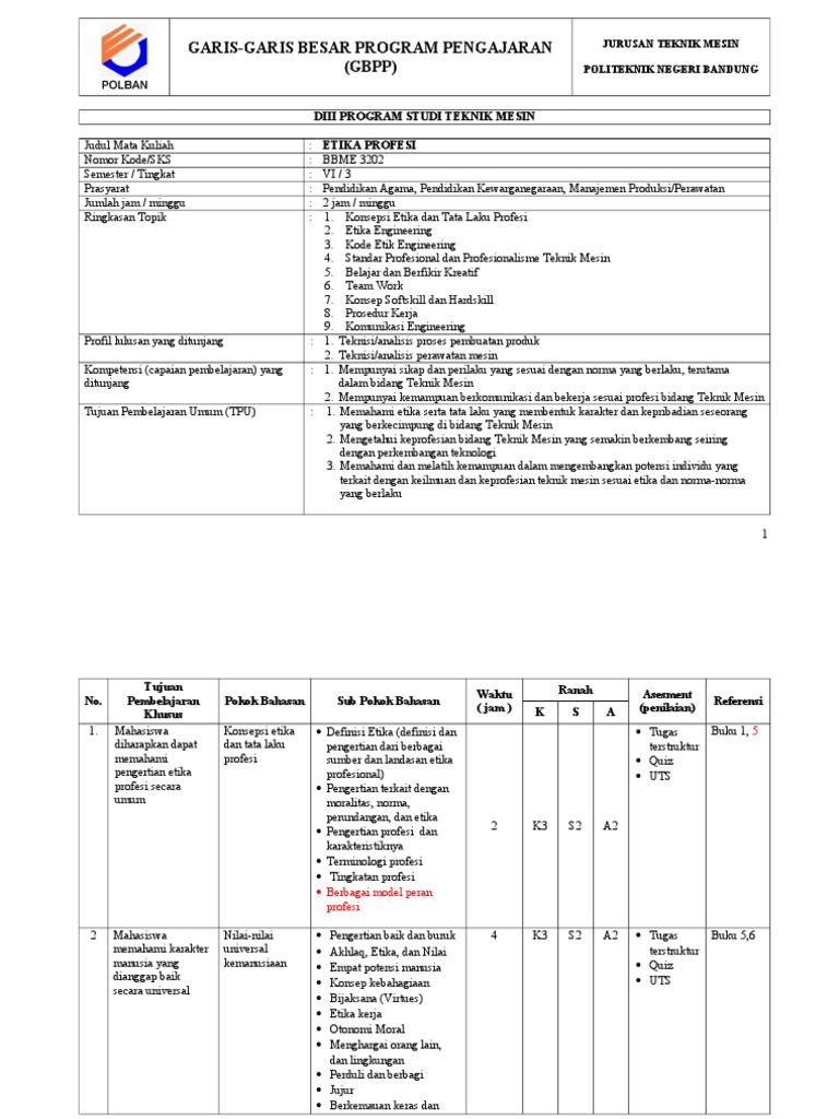 Garis-Garis Besar Program Pengajaran (GBPP): Diii Program Studi Teknik Mesin