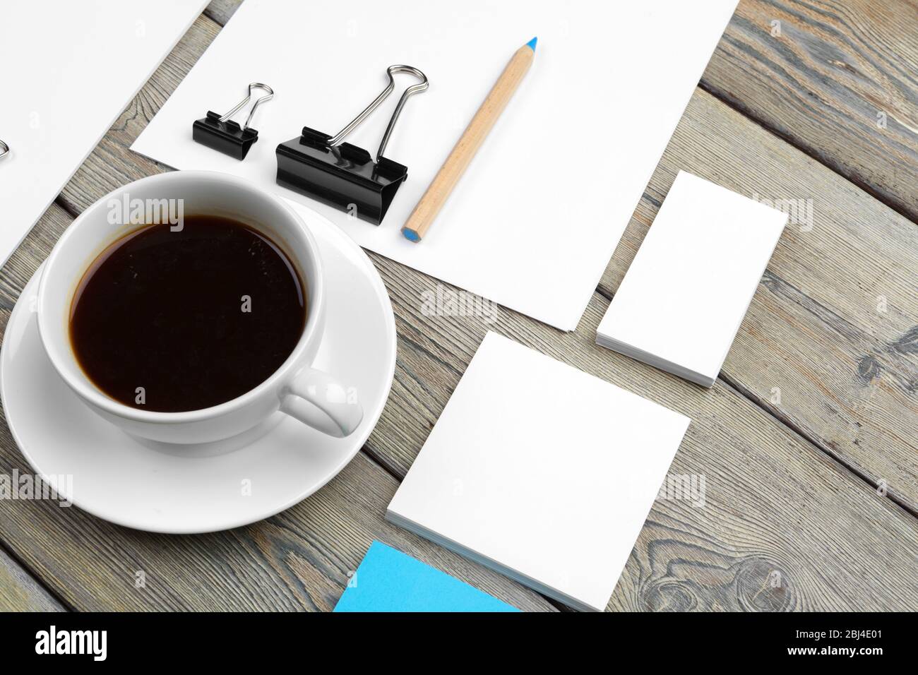 Mock up set of id template, notebook and cup of coffee. Coffee break background Stock Photo - Alamy