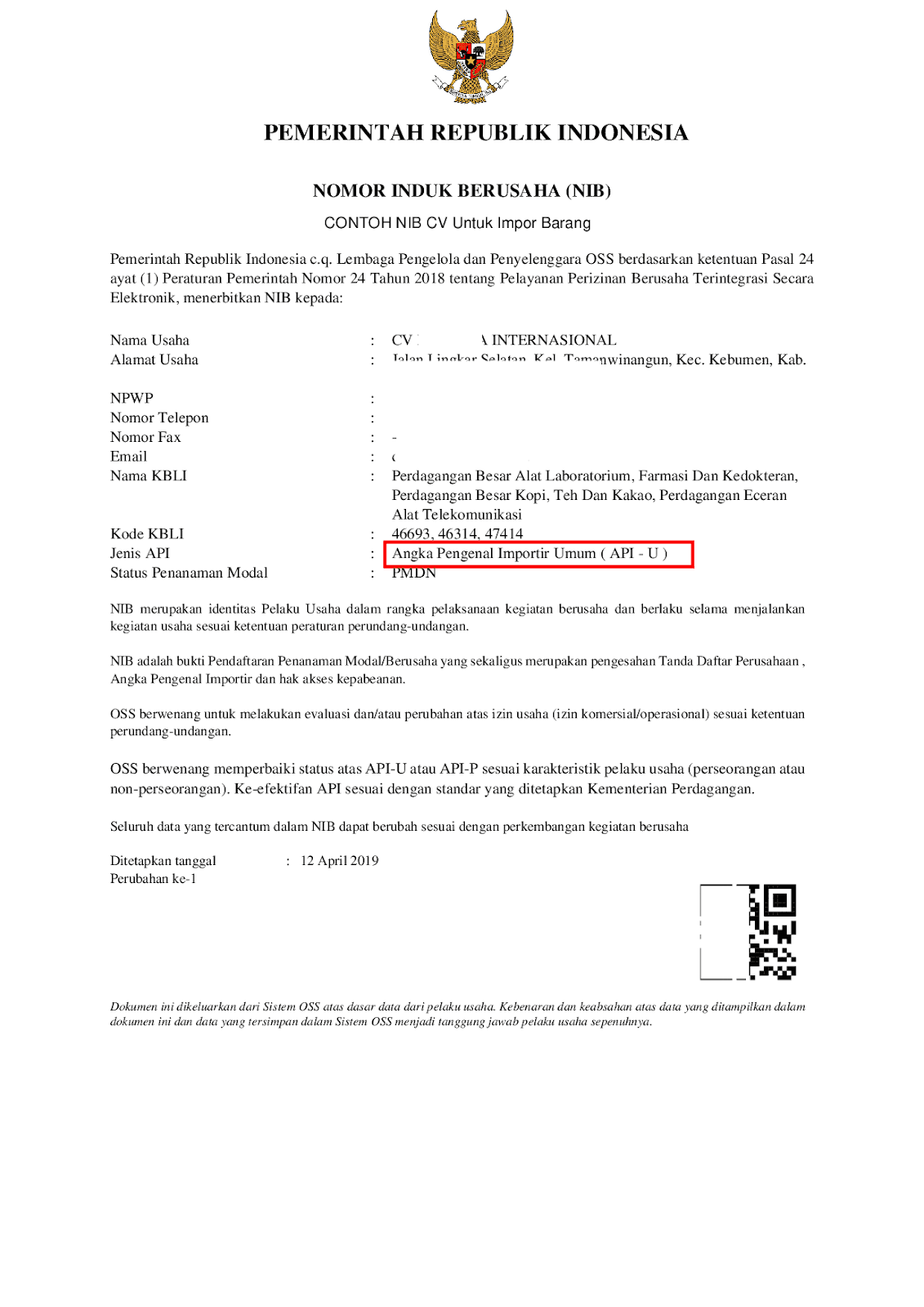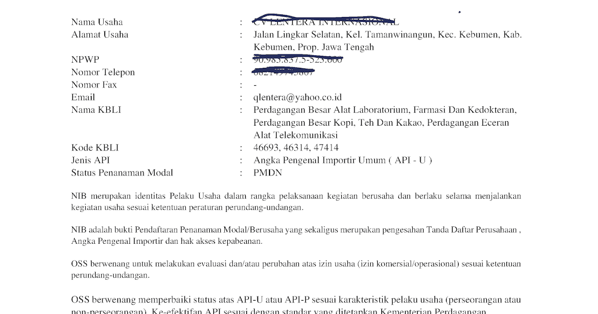 Contoh NIB PT-NIB CV-NIB Perseorangan I Nomor Induk Berusaha (NIB) Untuk Impor Barang - Indonesia Undername Import Export Blog