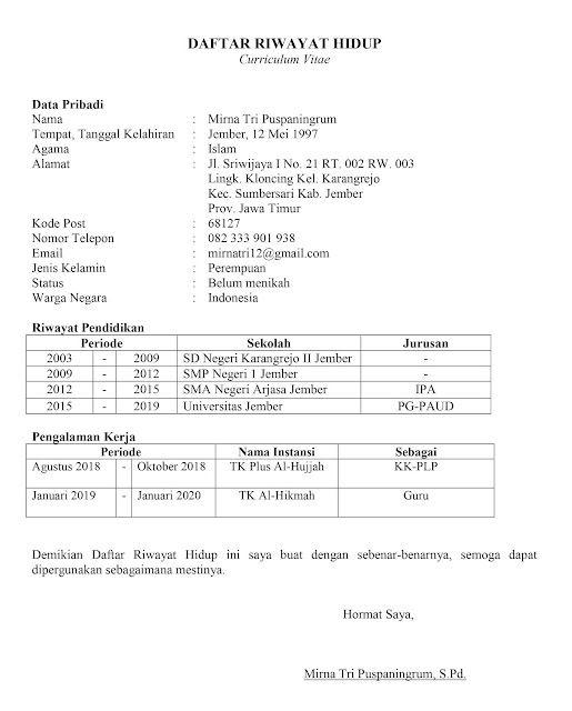 Contoh Daftar Riwayat Hidup Guru Paud - Gawe CV
