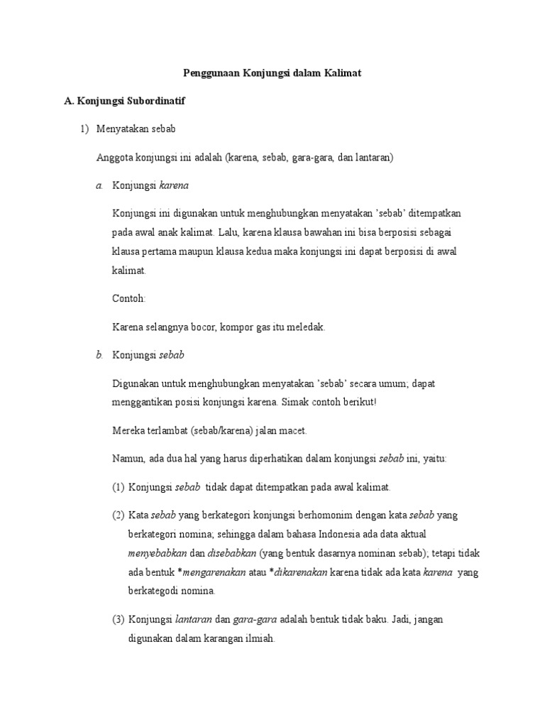 Penggunaan Konjungsi dalam Kalimat. Anggota konjungsi ini adalah (karena, sebab, gara-gara, dan lantaran) - PDF Free Download