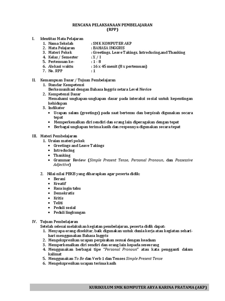 RPP Bahasa Inggris Kelas X SMK KOMPUTER AKP