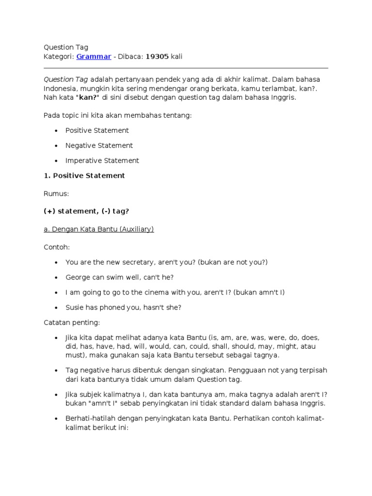 1. Umum: Question tag adalah untuk sebuah pertanyaan yang dibuat dalam satu kalimat untuk sebuah