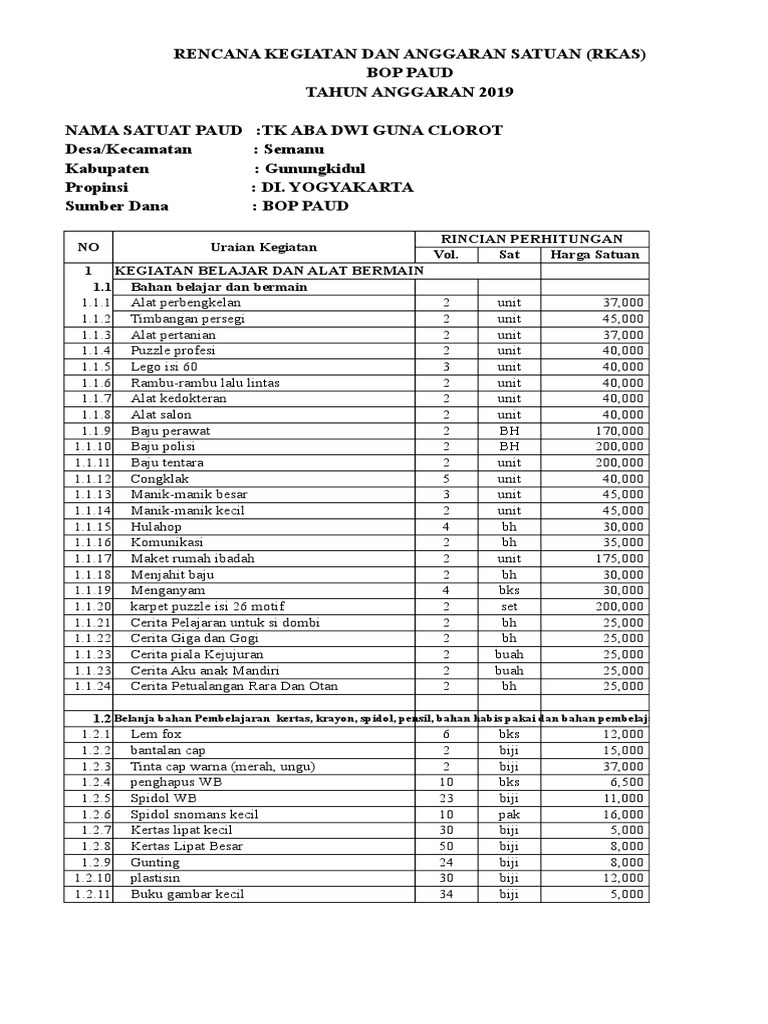 DOC) Contoh RKAS TK/PAUD Tahun Anggaran 2017 | Nandang Suharjo and Berkas PAUD - Academia.edu
