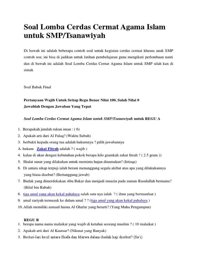 Soal Cerdas Cermat Agama Islam Tingkat Smpmts
