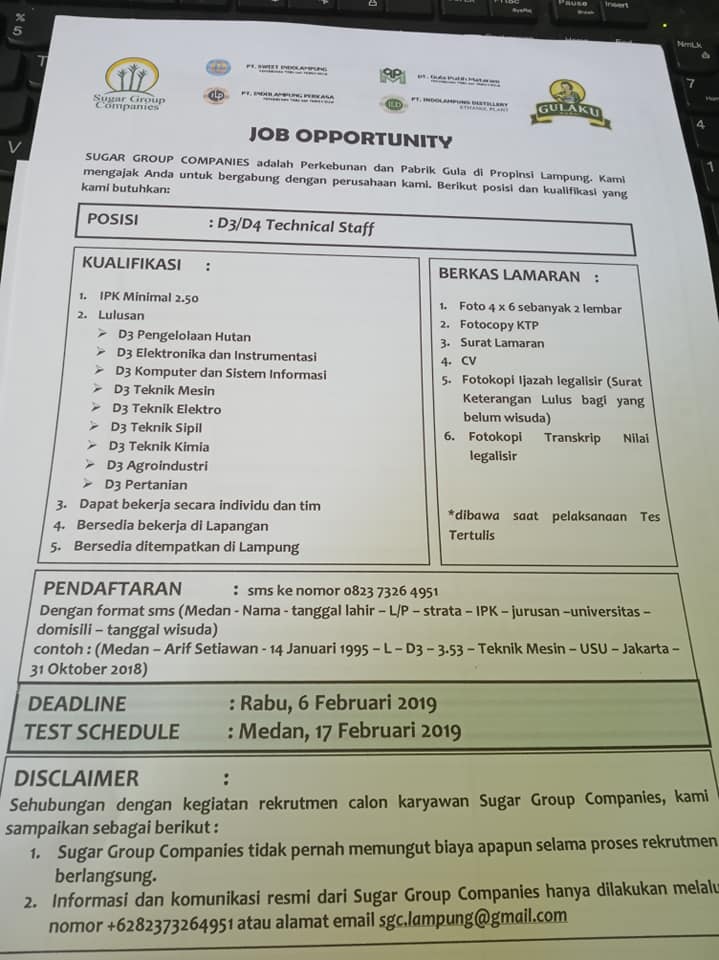 Loker Technical Staff, Staff - PT. Sugar Group Companies - Cepet Dapet Kerja