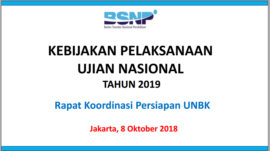 KEBIJAKAN PELAKSANAAN UJIAN NASIONAL TAHUN 2019 BERDASARKAN RAPAT KOORDINASI PERSIAPAN UNBK JAKARTA, 8 OKTOBER 2018 ~ ZUHRI INDONESIA