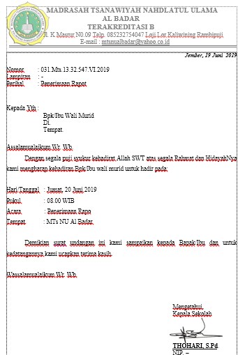 Contoh Surat Pengambilan Raport Wali Murid - MTs NU AL BADAR