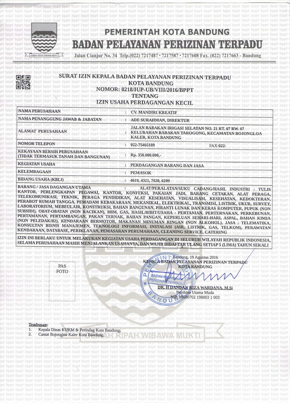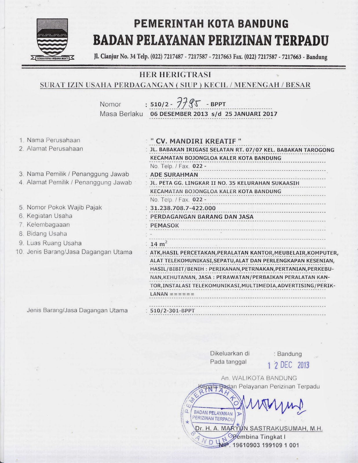 CV. Mandiri Kreatif: SIUP. TDP. HO. Surat Ijin CV. Mandiri Kreatif