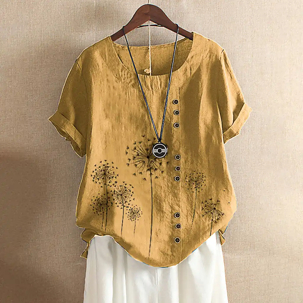Blus 2020 Wanita Gambar Bunga Vintage Linen Atasan Blus Wanita Tombol Kemeja Lengan Pendek Musim Panas Blusas Kaftan Kebesaran Kemeja| | - AliExpress