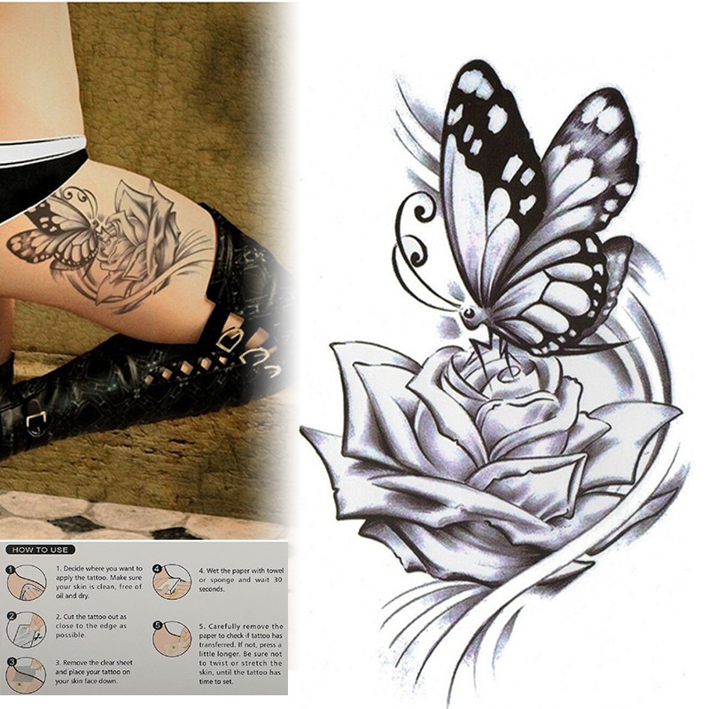 Stiker Tato Sementara Tahan Air Gambar Bunga Mawar dan Kupu-Kupu Besar Warna Hitam | Shopee Indonesia