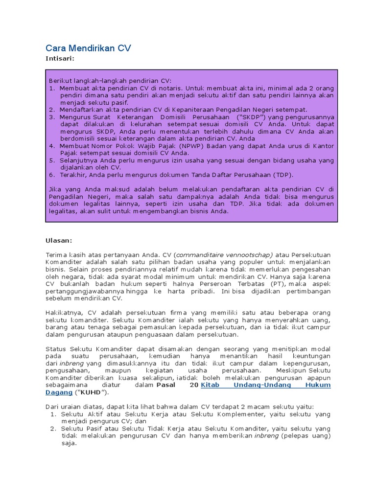 DOC) Cara mendirikan CV Kontraktor 1. Akte Pendirian Badan Usaha | upie galur - Academia.edu