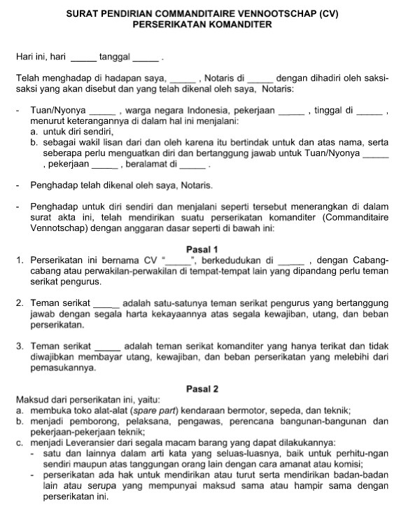 Contoh Surat Perjanjian Pendirian Commanditaire Vennootschap (CV) Resmi Terbaru Format Word - IDNOffice