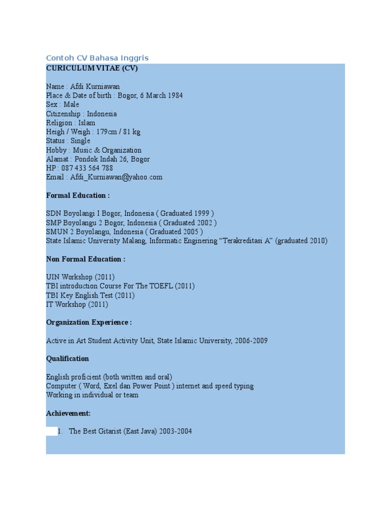 Contoh Curriculum Vitae Bahasa Inggris Lamaran Kerja | KampusUNJ.com