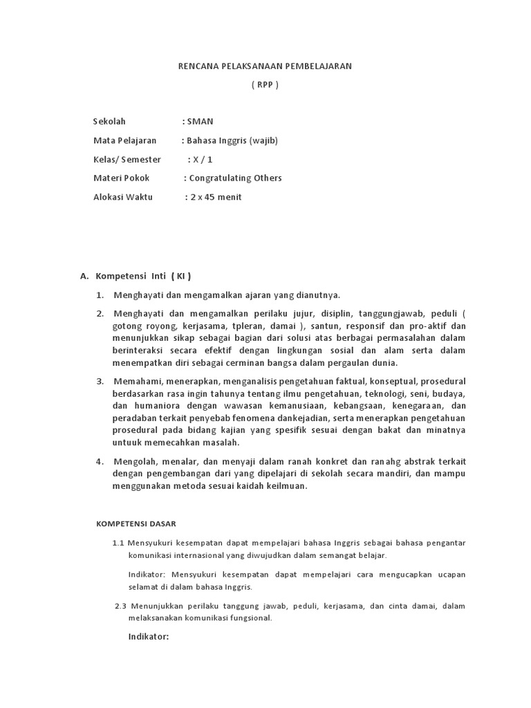 RPP BAHASA INGGRIS UCAPAN SELAMAT BERSAYAP KELAS X KURIKULUM 2013