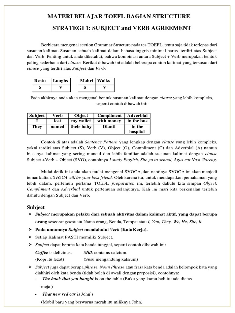 Materi Belajar Toefl Bagian Structure Strategi 1: Subject And Verb Agreement