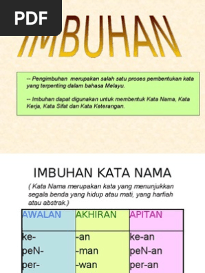 Pembentukan Kata. Imbuhan Awalan. Imbuhan Akhiran. Imbuhan awalan ialah imbuhan yang kedudukannya di awal sesuatu kata dasar. - PDF Download Gratis