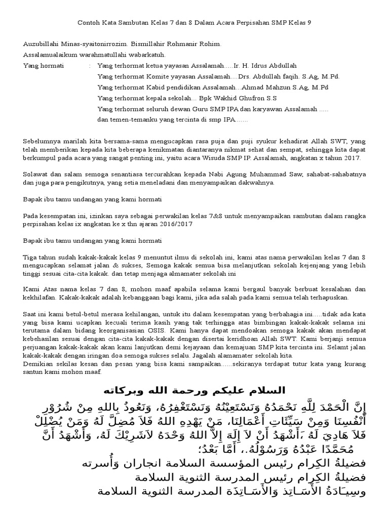 Contoh Kata Sambutan Kelas 7 Dan 8 Dalam Acara Perpisahan SMP Kelas 9