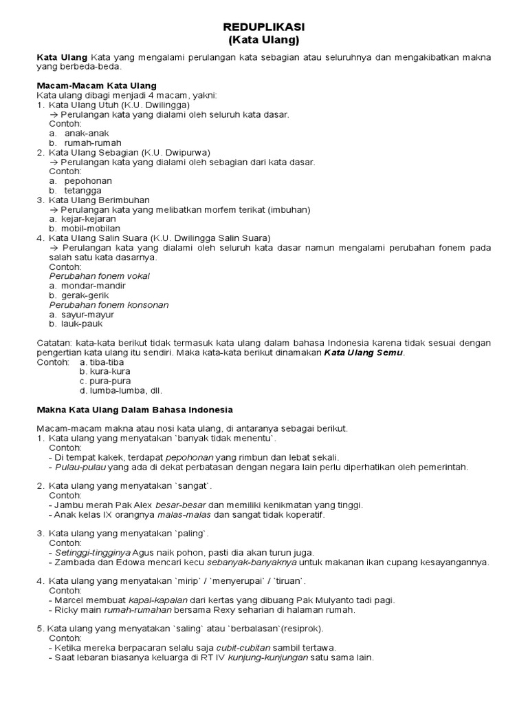 Reduplikasi (Kata Ulang): Kata Ulang Kata yang mengalami perulangan kata sebagian atau seluruhnya dan mengakibatkan makna