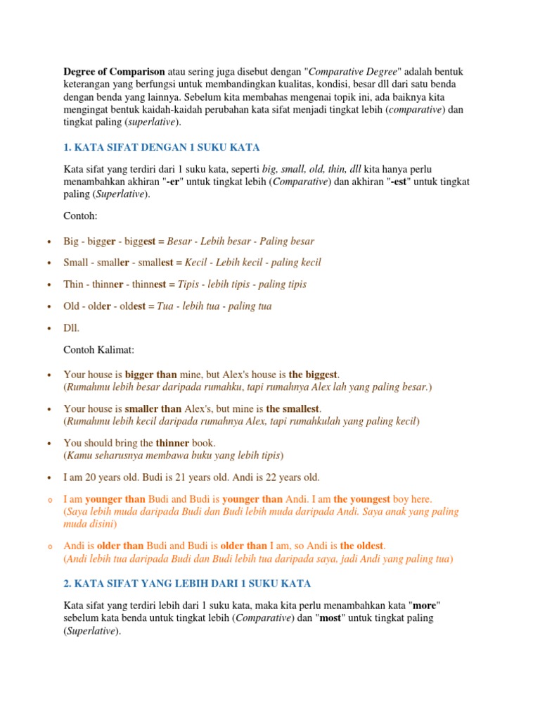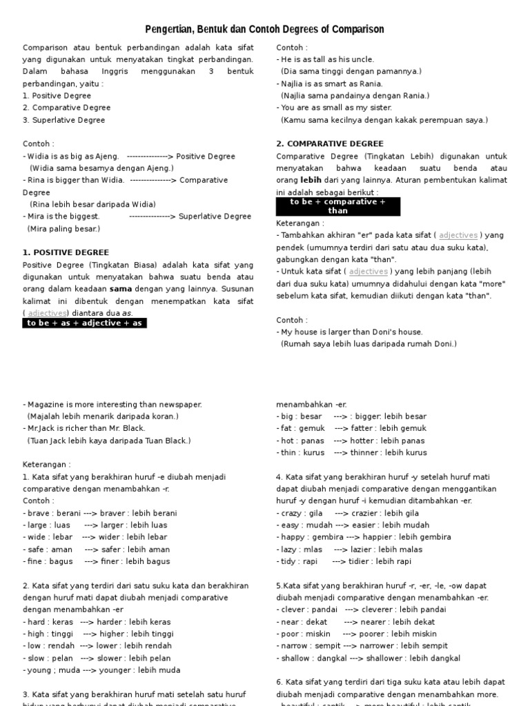 Pengertian dan Contoh The Degrees of Comparison degree. (Tingkat perbandingan / lebih) 3. Superlative degree. (Tingkat terbaik/ paling) Bentuk … 6. Kata sifat yang terdiri atas dua - [PDF Document]