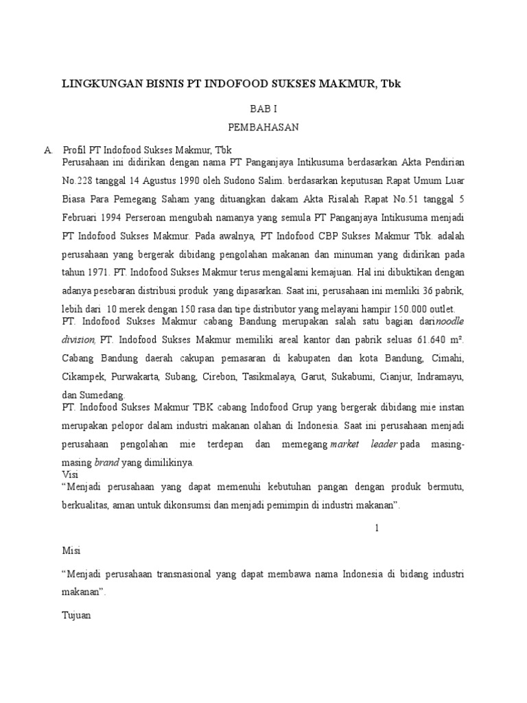 Makalah - BAB I PENDAHULUAN 1.1 Latar Belakang PT Indofood Sukses Makmur Tbk merupakan salah satu perusahaan mie instant dan makanan olahan terkemuka di | Course Hero