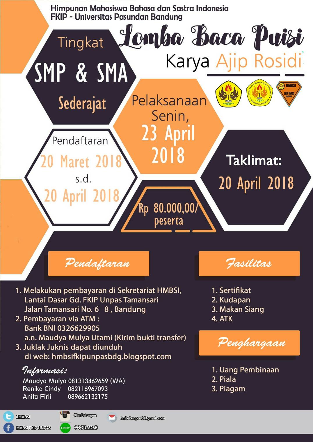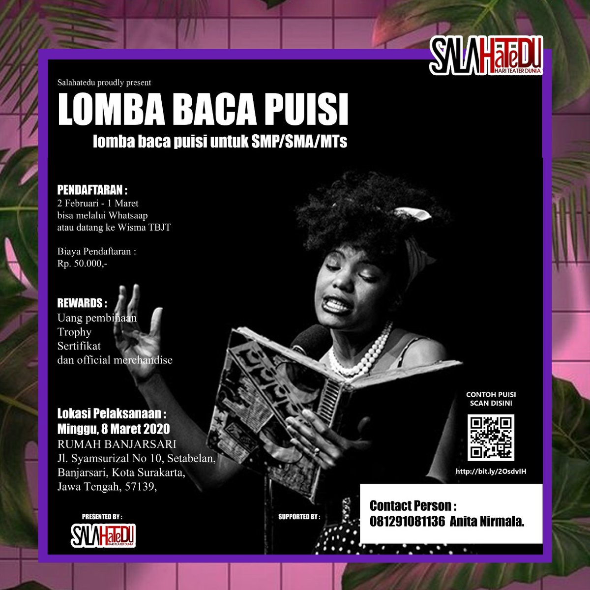 SALA HATEDU on Twitter: “[ PENDAFTARAN ] LOMBA BACA PUISI TINGKAT SMP, SMA KUOTA TERBATAS!!! Segera daftarkan tim kamu via CP atau bisa datang ke Wisma Seni TBJT Info: Instagram : @salahatedu