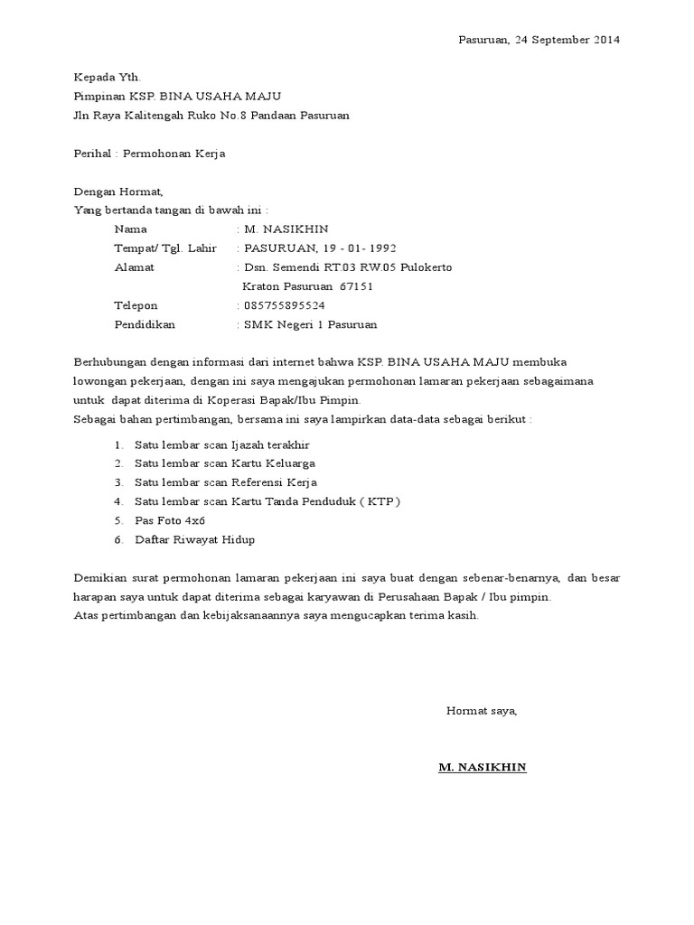 Contoh Surat Lamaran Kerja Di Ksp