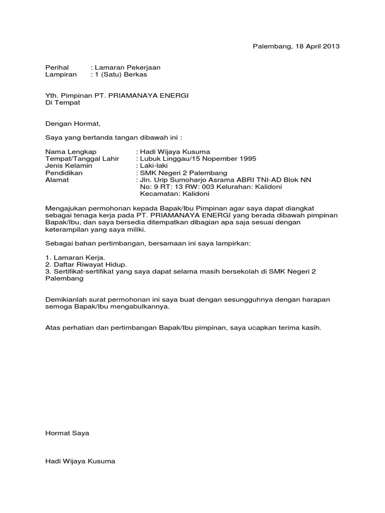 Contoh Surat Lamaran Kerja Pln Untuk Sma – Backup Gambar