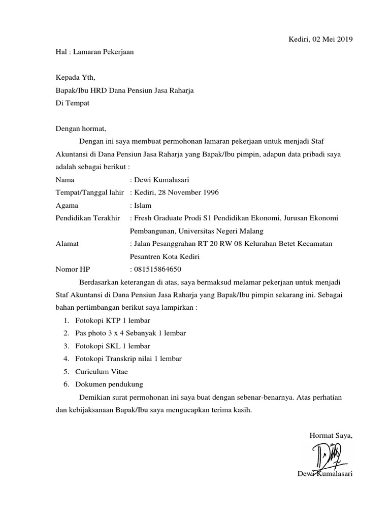 Contoh Surat Lamaran Kerja Pt Jasa Raharja