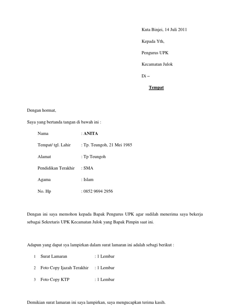 contoh surat lamaran kerja ke pt tulis tangan - Gawe CV