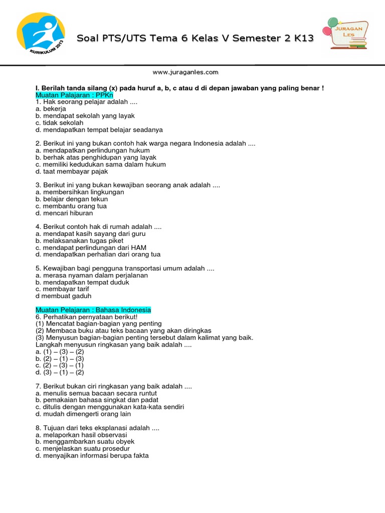 Soal PTS/UTS Tema 6 Kelas V Semester 2 K13