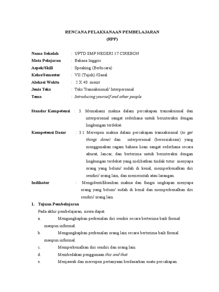 RPP bahasa Inggris SMP (introducing-speaking skill )
