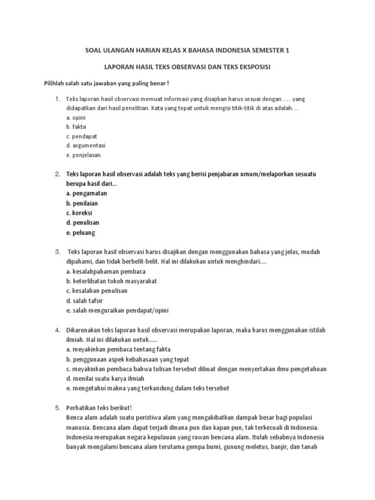 Soal Ulangan Harian Kelas X Bahasa Indonesia Semester 1 Laporan Hasil Teks Observasi Dan Teks Eksposisi