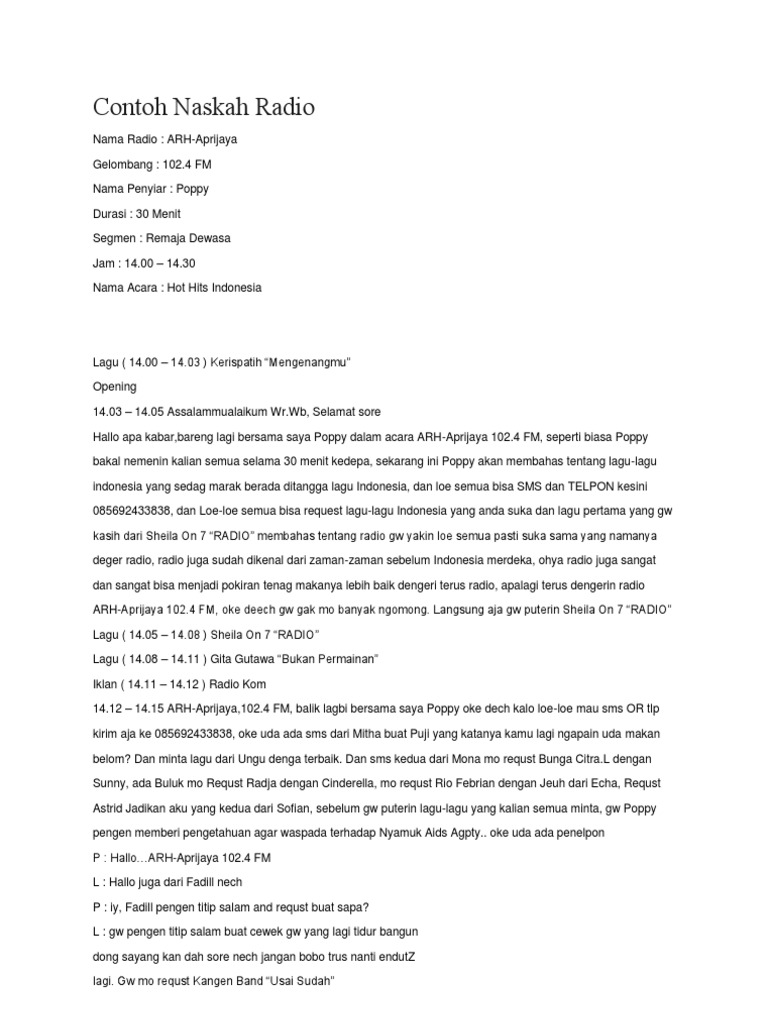DOC) Contoh Naskah Siaran Radio | Chairani Novi - Academia.edu