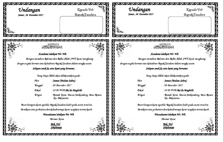 Contoh Undangan Aqiqah Simpel versi word doc Kertas A4 dibagi 4