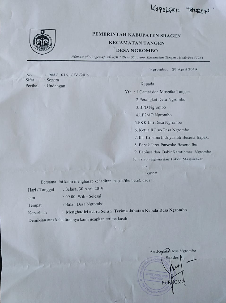 Undangan Sertijab Kades Ngrombo 30 April 2019