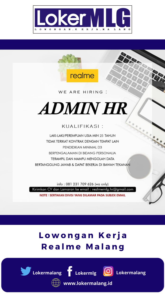 IG @Lokermalang : " #Lokermalang REALME MALANG WALK IN INTERVIEW Jumat, 14 Agustus 2020 1. PROMOTOR 2. OB TEKNISI 3. ADMIN HR Kirimkan CV & lamaran ke email : realmemlg.hr@gmail.com