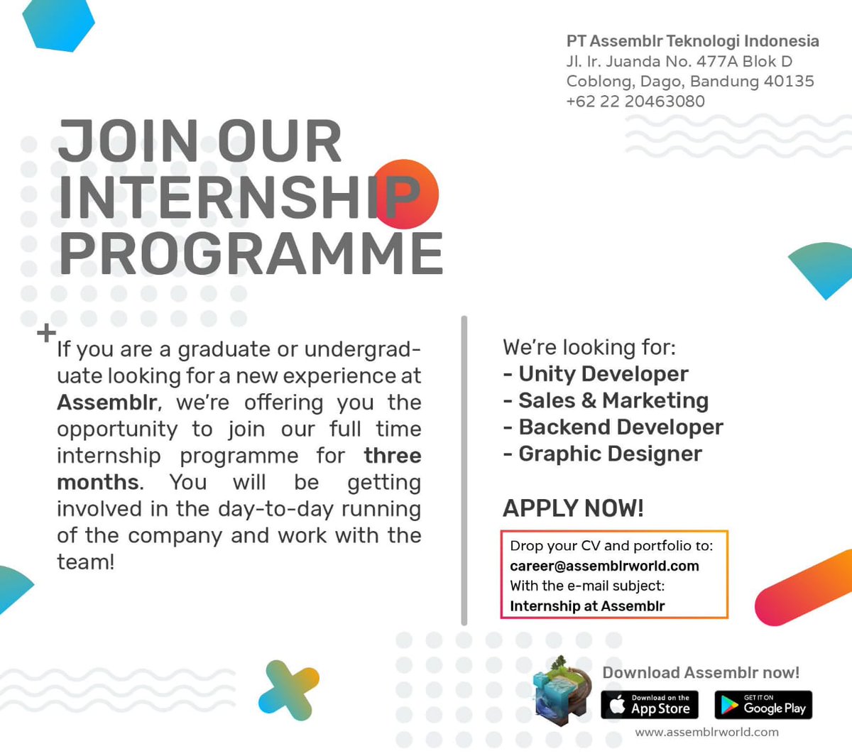 Kampus Update on Twitter: “PT Assemblr Teknologi Indonesia is looking for graduate or undergraduate that willing to do the full time internship in Assemblr. They are looking for several positions! Apply now