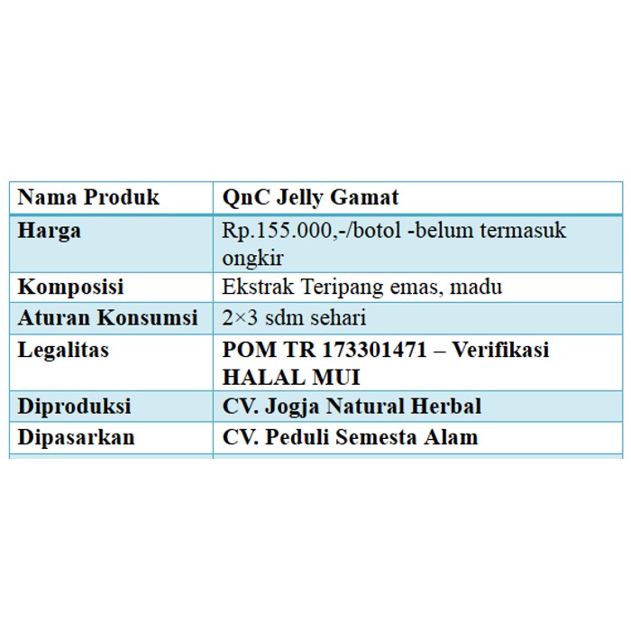 Deskripsi Produk QnC Jelly Gamat Kemasan Baru dilengkapi barcode 300 ml POM TR 173301471 CV PEDULI SEMESTA ALAM Bersertifikat HALAL dari MUI | by Jelli Gamat | Medium