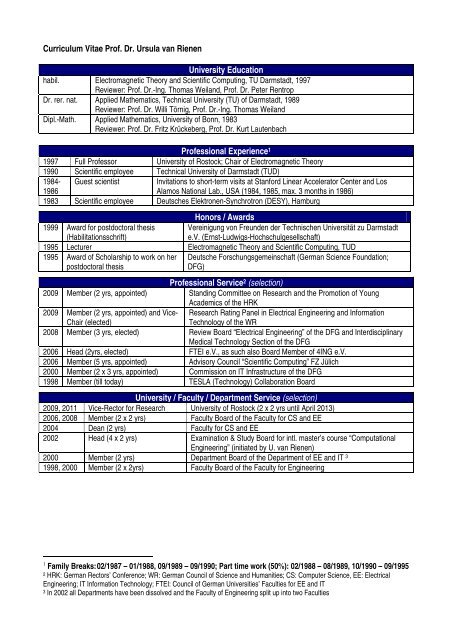 Curriculum Vitae Prof. Dr. Ursula van Rienen University Education …