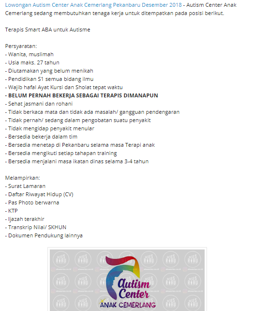 Lowongan Kerja Autism Center Anak Cemerlang Pekanbaru | Desember 2018 | SimpananKU - Berita Terupdate Hari Ini