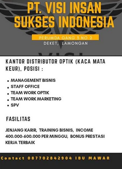 Lowongan Kerja PT. Visi Insan Sukses Indonesia Lamongan | Januari 2019 | SimpananKU - Berita Terupdate Hari Ini