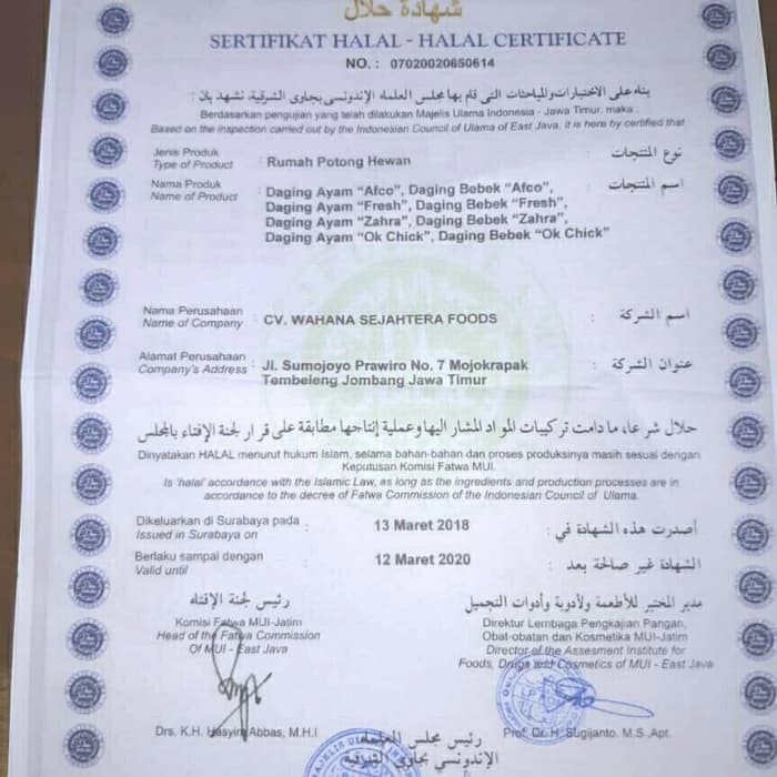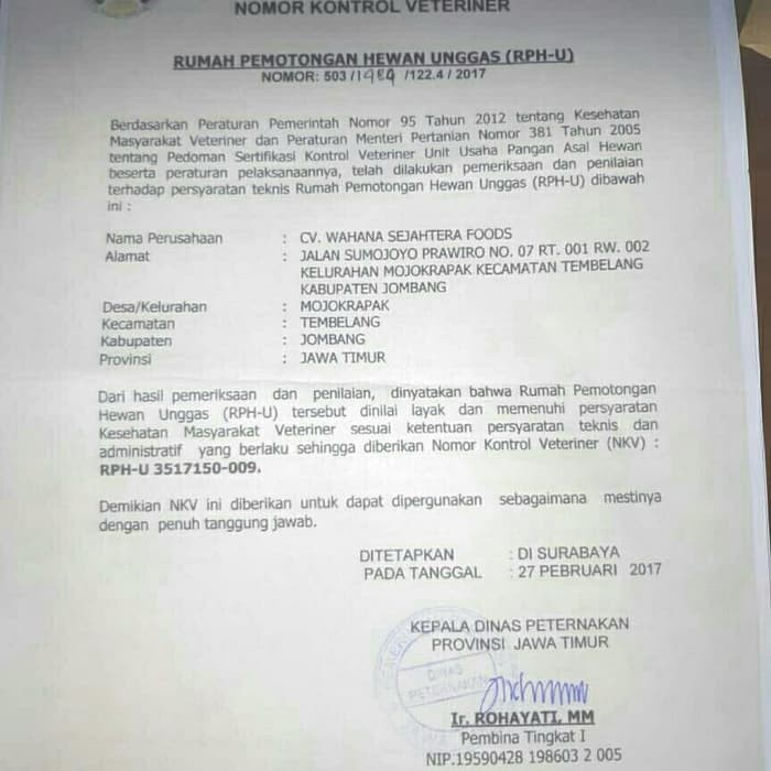 CV. Wahana Sejahtera Foods, Jl. Sumojoyo Prawiro No 132, Dsn Bulak, Ds Mojokrapak, Kec Tembelang, Jombang (2020)